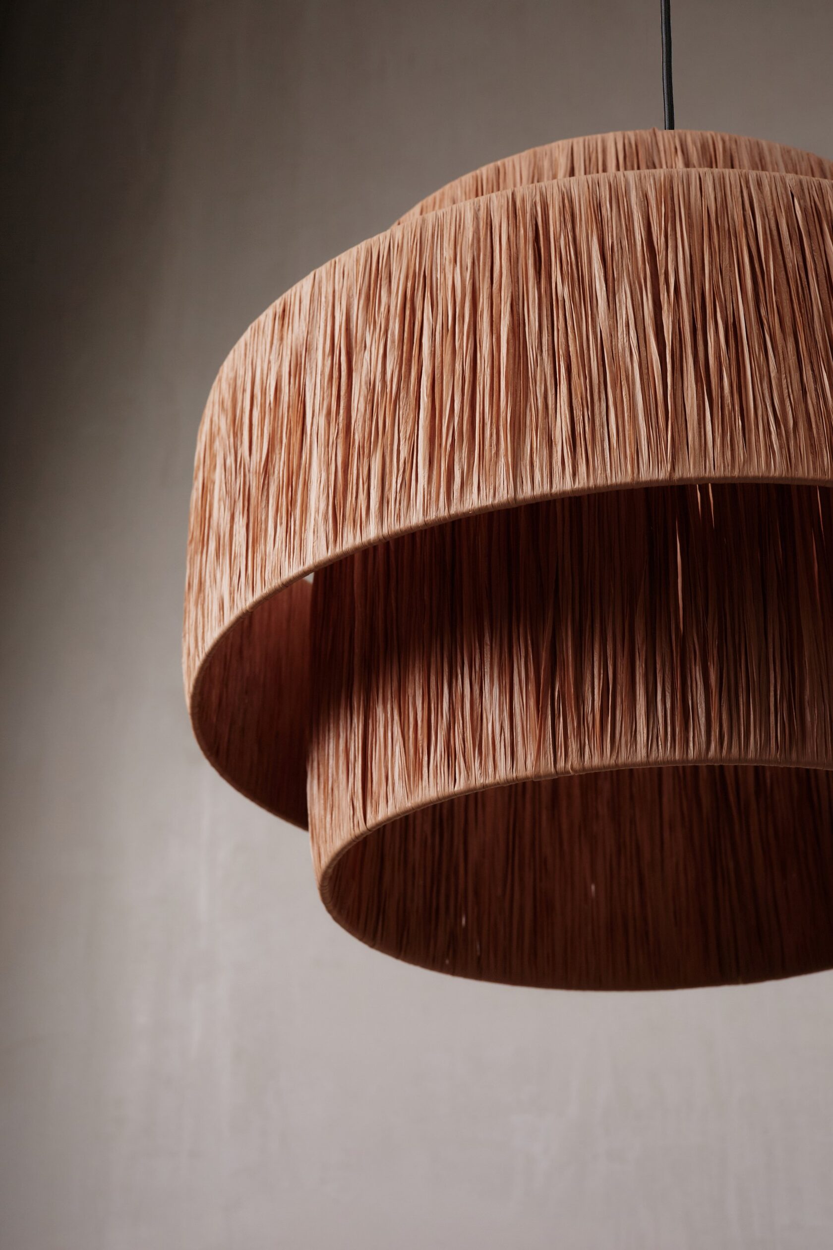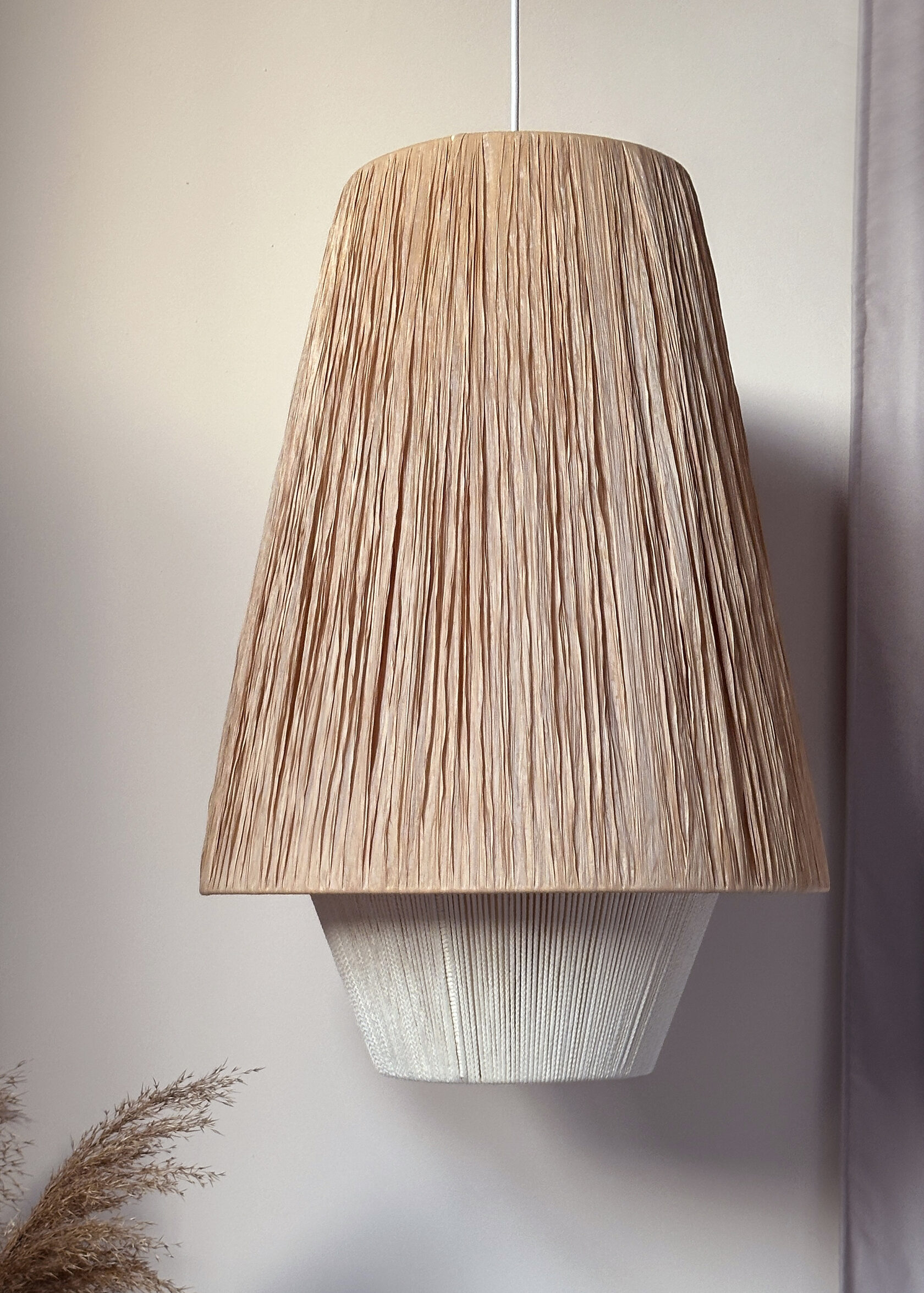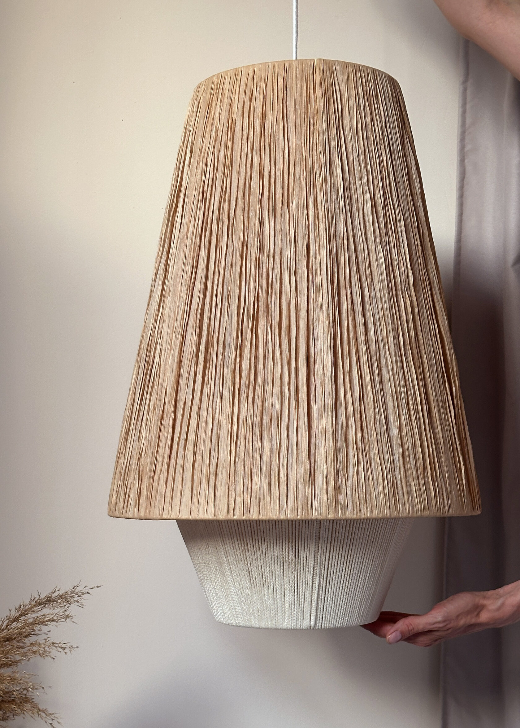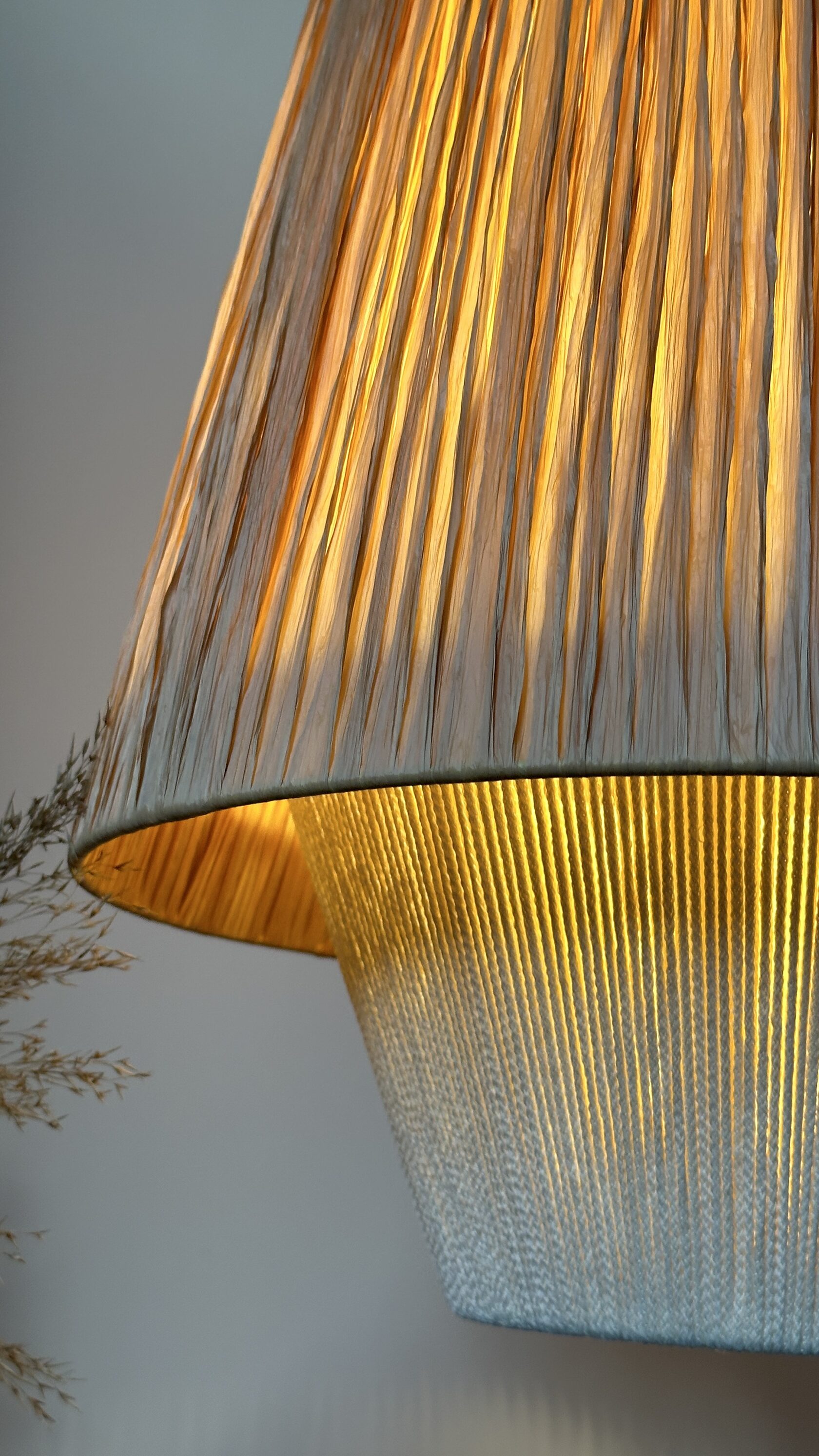 Светильник "Raffia 2" из нашей линейки светильников из натурального волокна пальмы рафии это воплощение уюта и тепла в вашем доме. Мягкие пшеничные оттенки с терракотовым подтоном, фактурность и тактильность абажура и невероятно уютное теплое свечение вечером. Мы предлагаем подвес (патрон и провод) в белом или черном цвете, что позволяет легко адаптировать светильник под ваш интерьер.