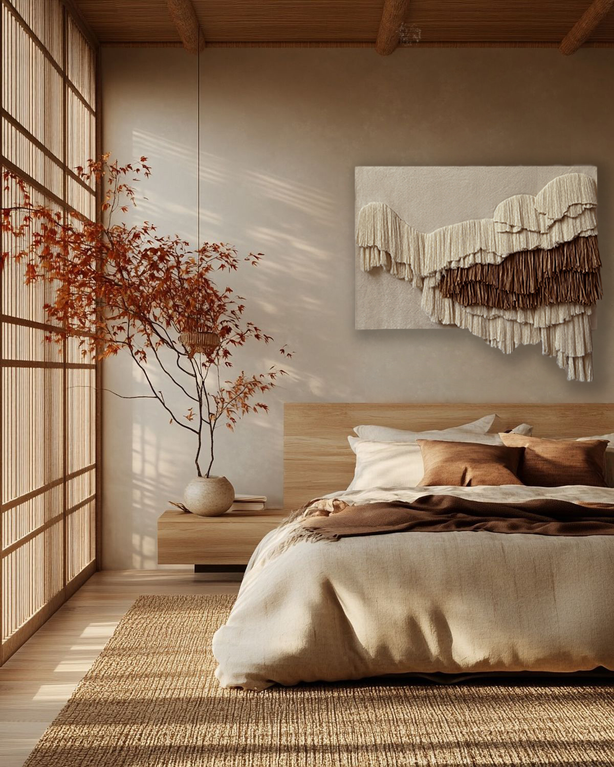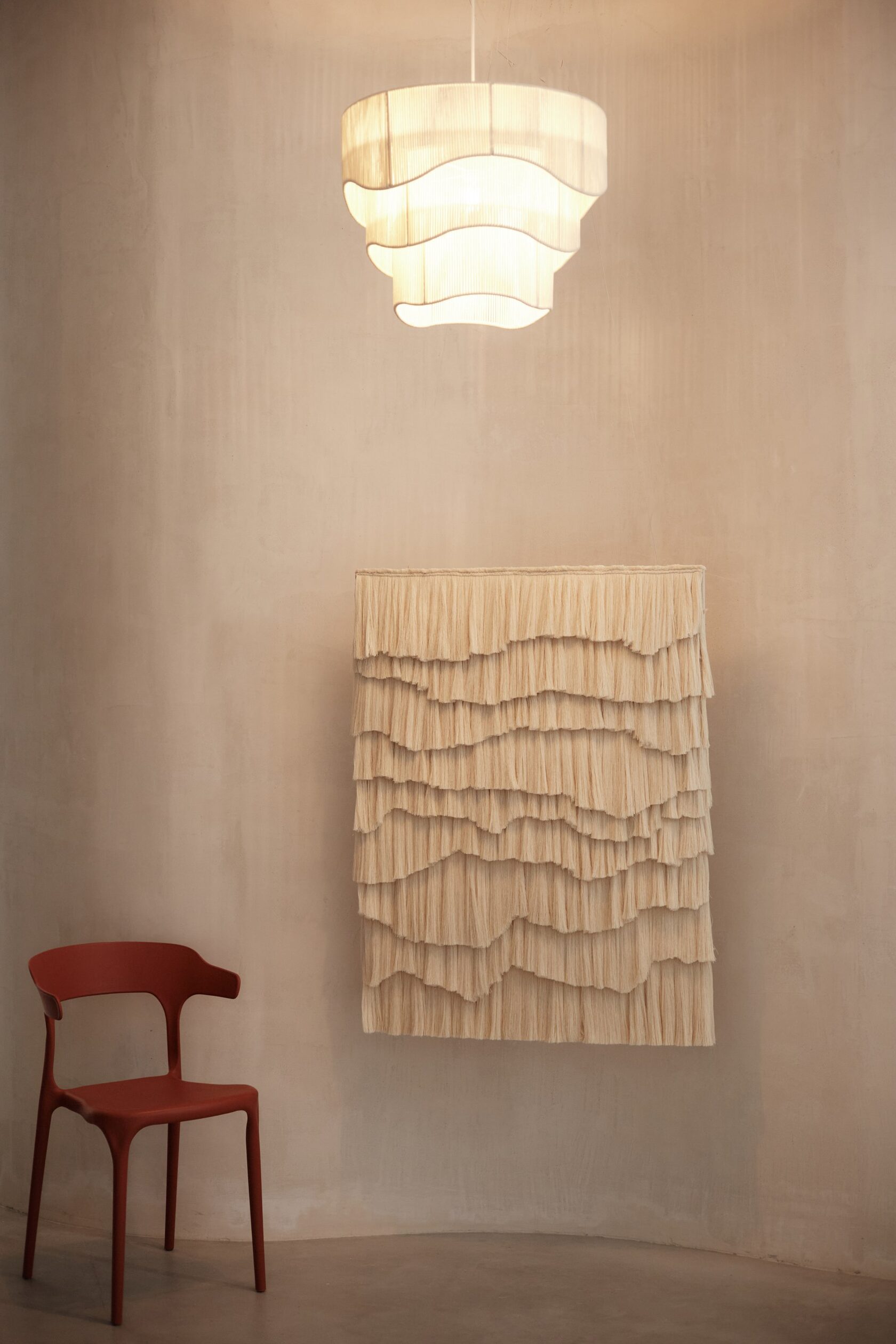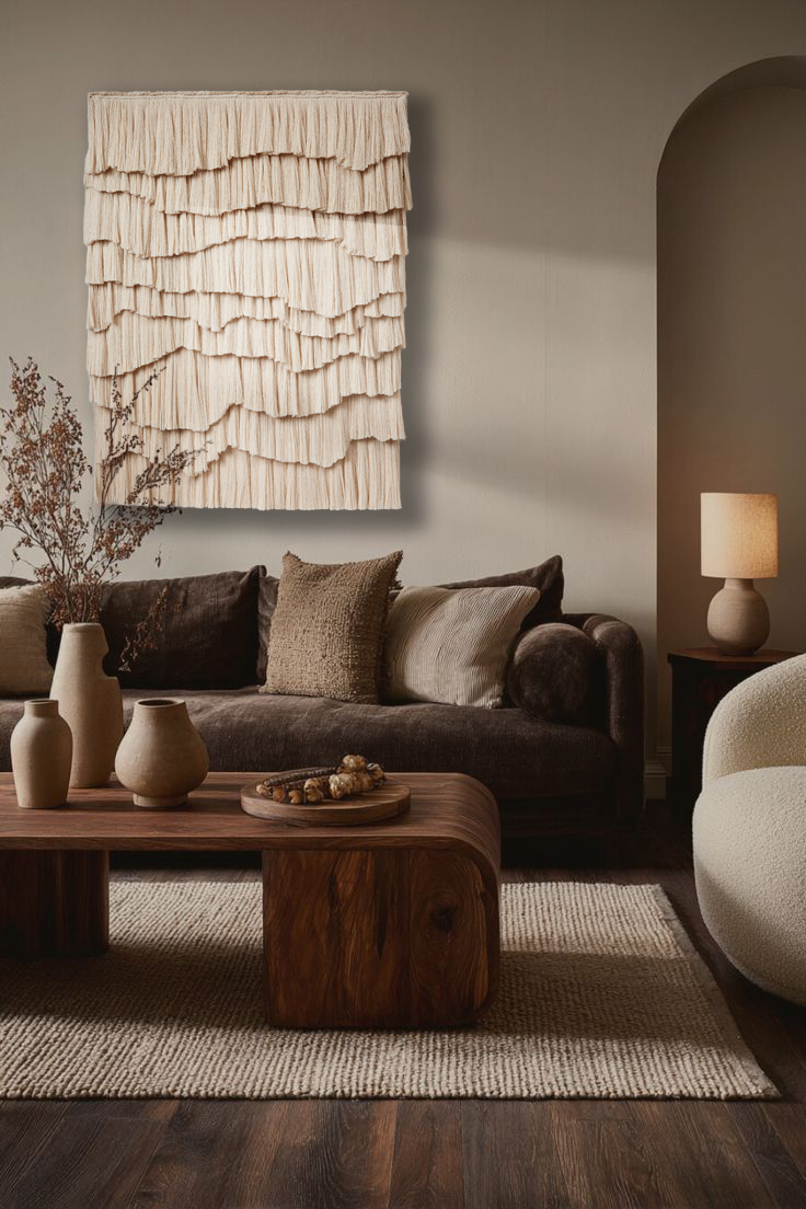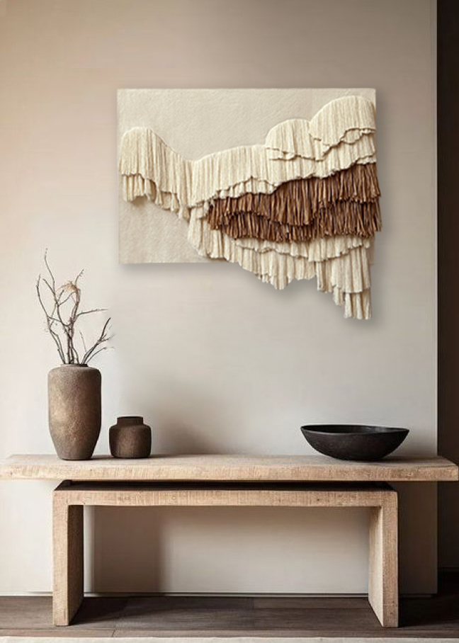 Текстильное панно "Гармония" выполнено из нежнейшего премиального органического хлопка и рафии в натуральном пшеничном оттенке. Этот уникальный элемент декора станет стильным акцентом в интерьере, идеально вписываясь в различные стили: современный минимализм, эко-стиль, ваби-саби, бохо, деревенский стиль или эклектику.