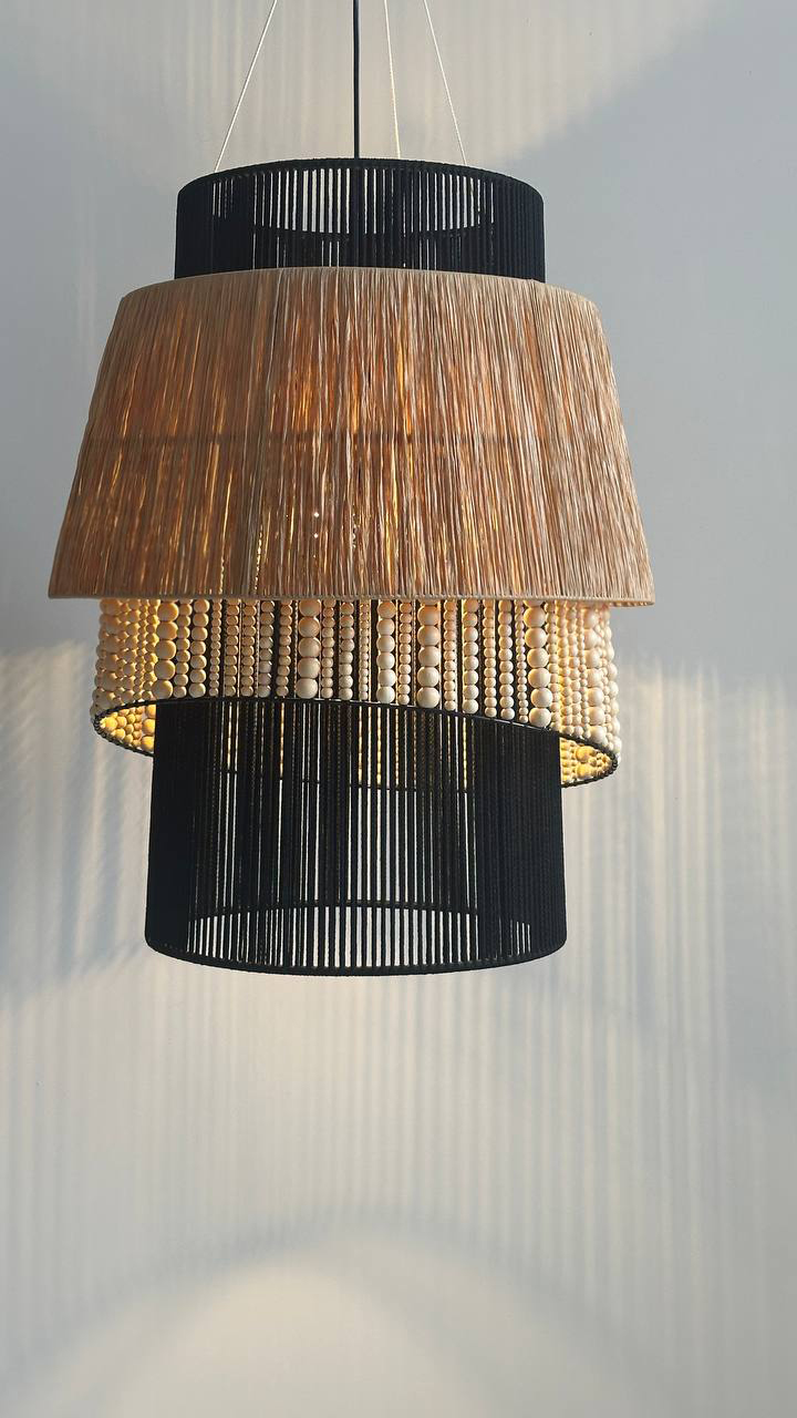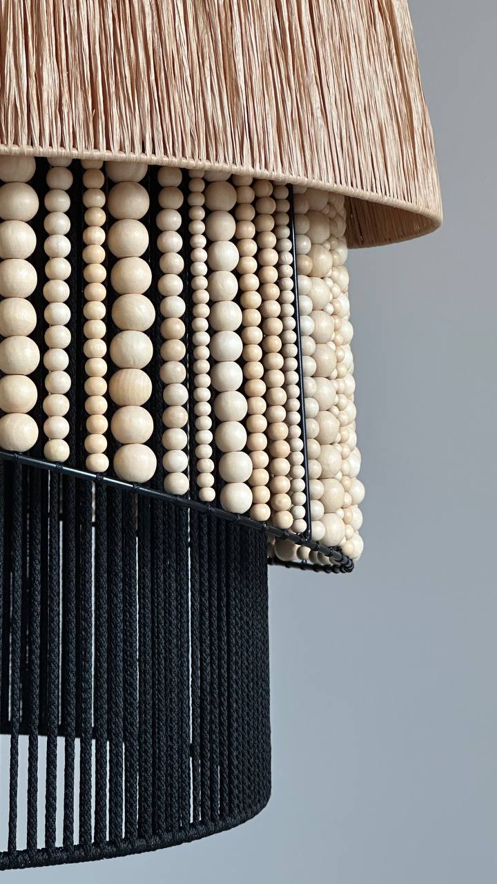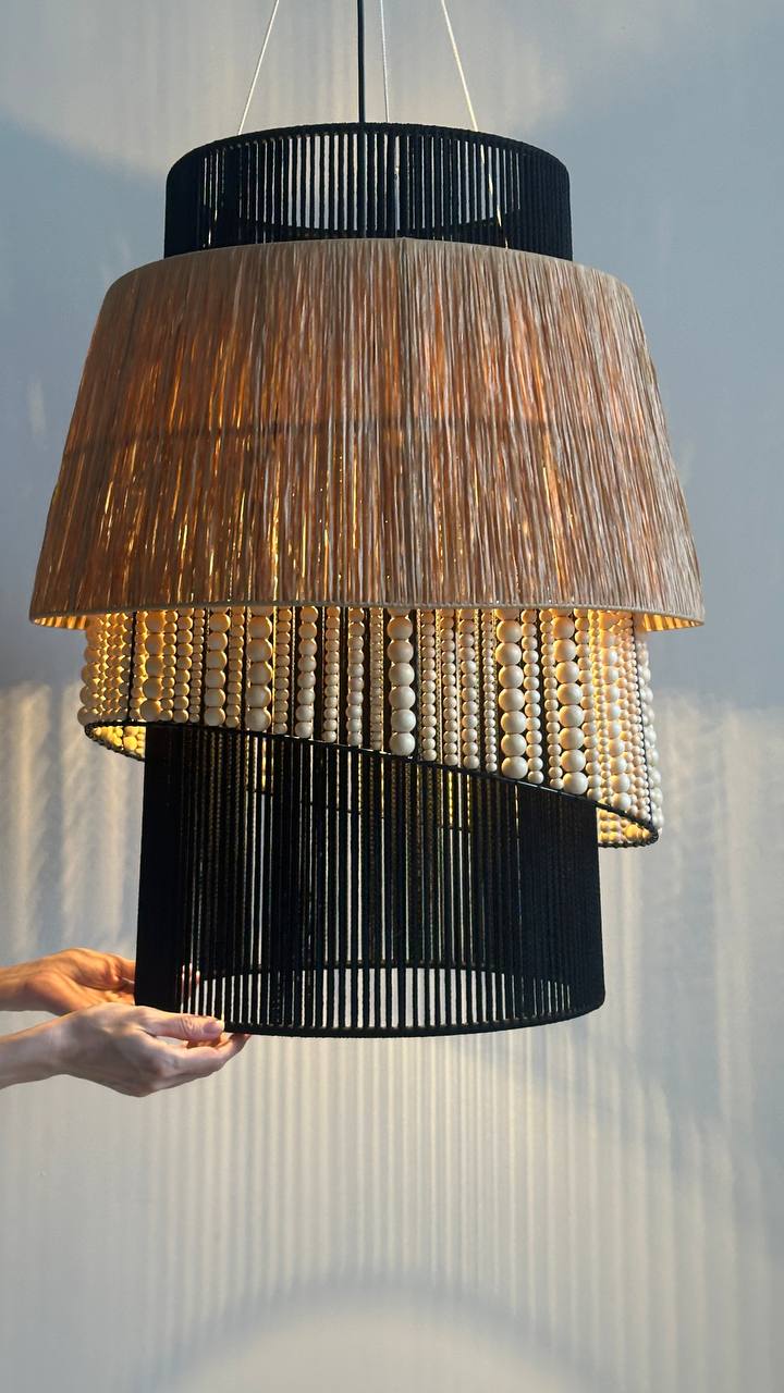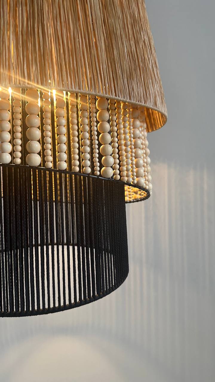 Абажур "Каскад" - это не просто предмет освещения, а настоящий арт-объект, способный стать центром притяжения вашего интерьера и подчеркнуть его индивидуальность. Для его изготовления использовано более 2 300 бусин различных размеров, сотни метров шнура и рафии. Многослойная форма "Каскада" создает волшебную игру светотеней, наполняя пространство мягким и атмосферным светом.