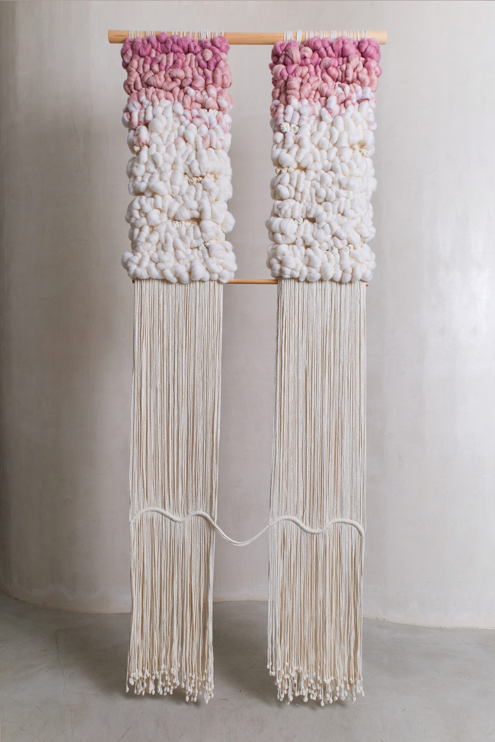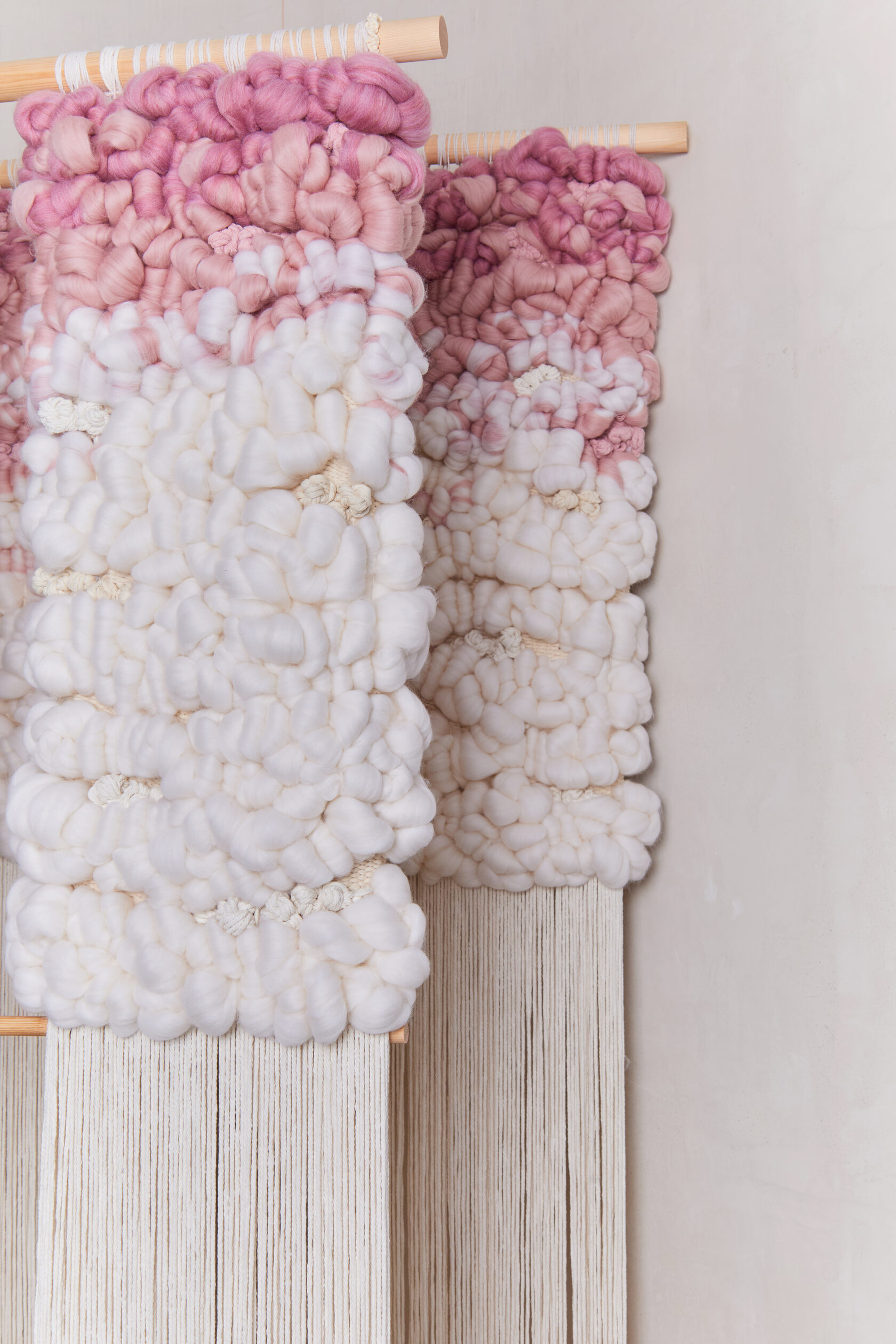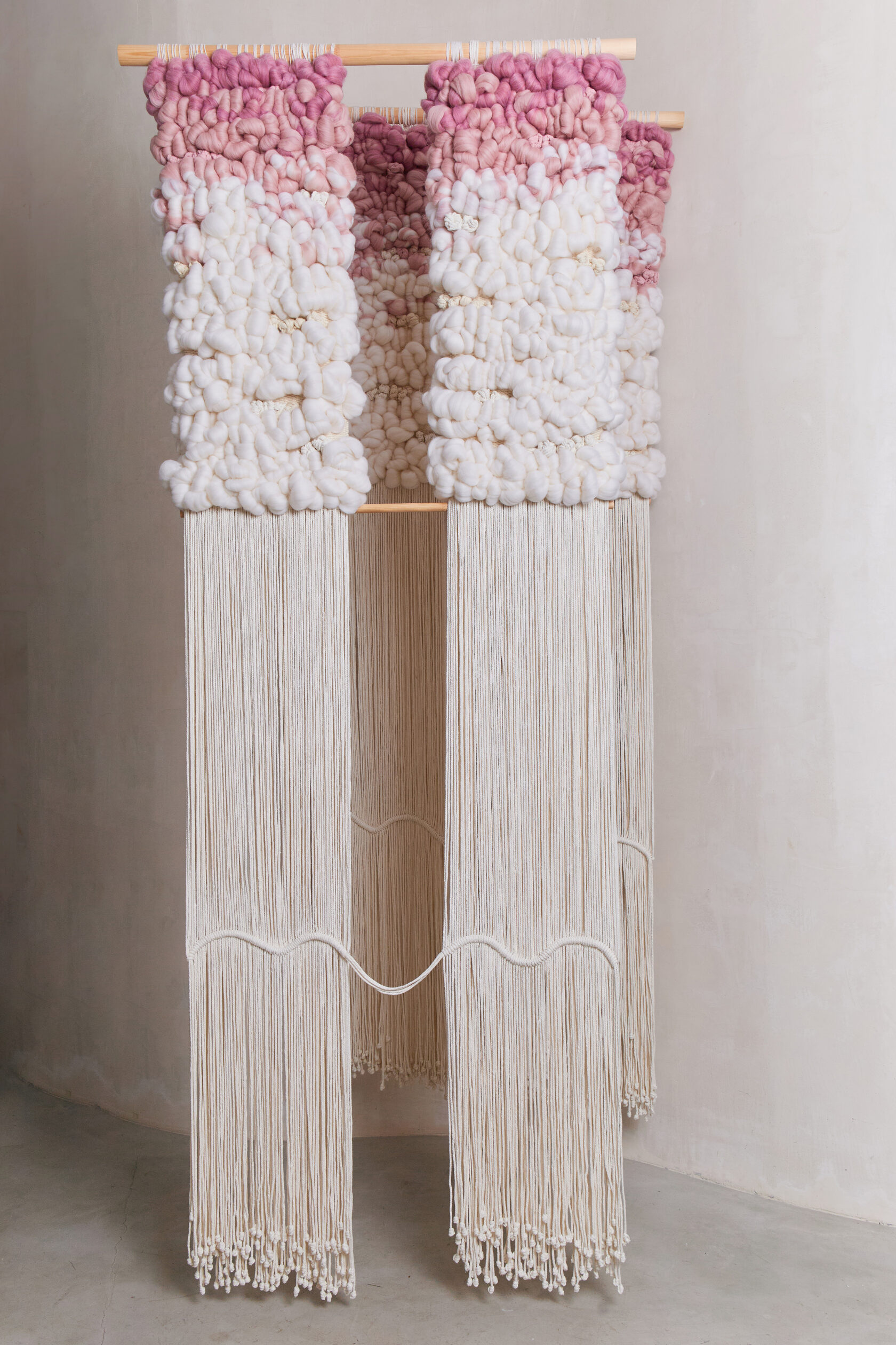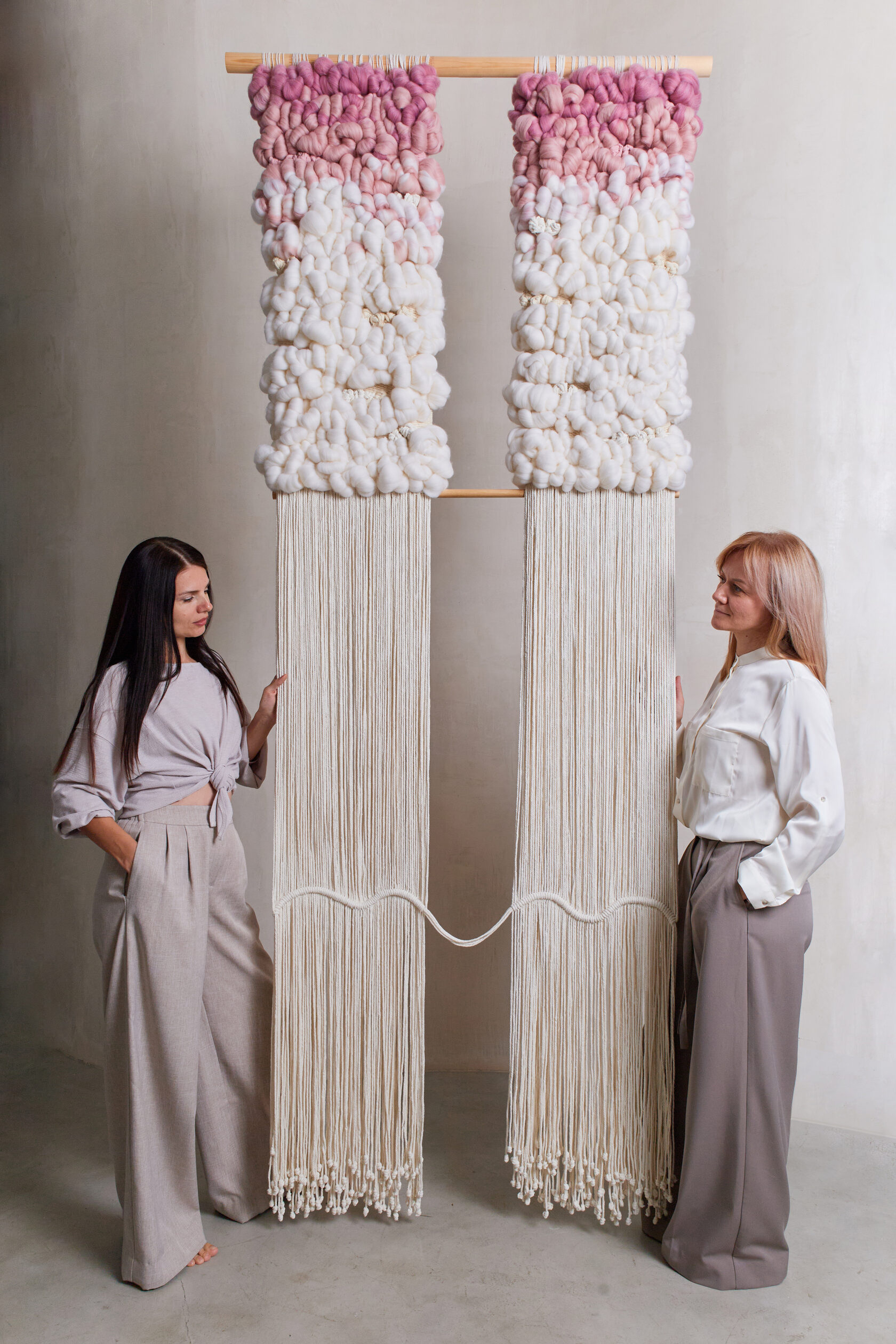 "Облачные грозы" - работа, выполненная в технике ткачества, созданная специально для экспозиции Trendrooms на выставке HomeTextile&HomeDesign в Москве (октябрь 2025). Композиция отличается воздушной фактурой, плавным переходом оттенков от насыщенного розового к мягкому молочному. Длинные нити создают эффект легкости и движения.